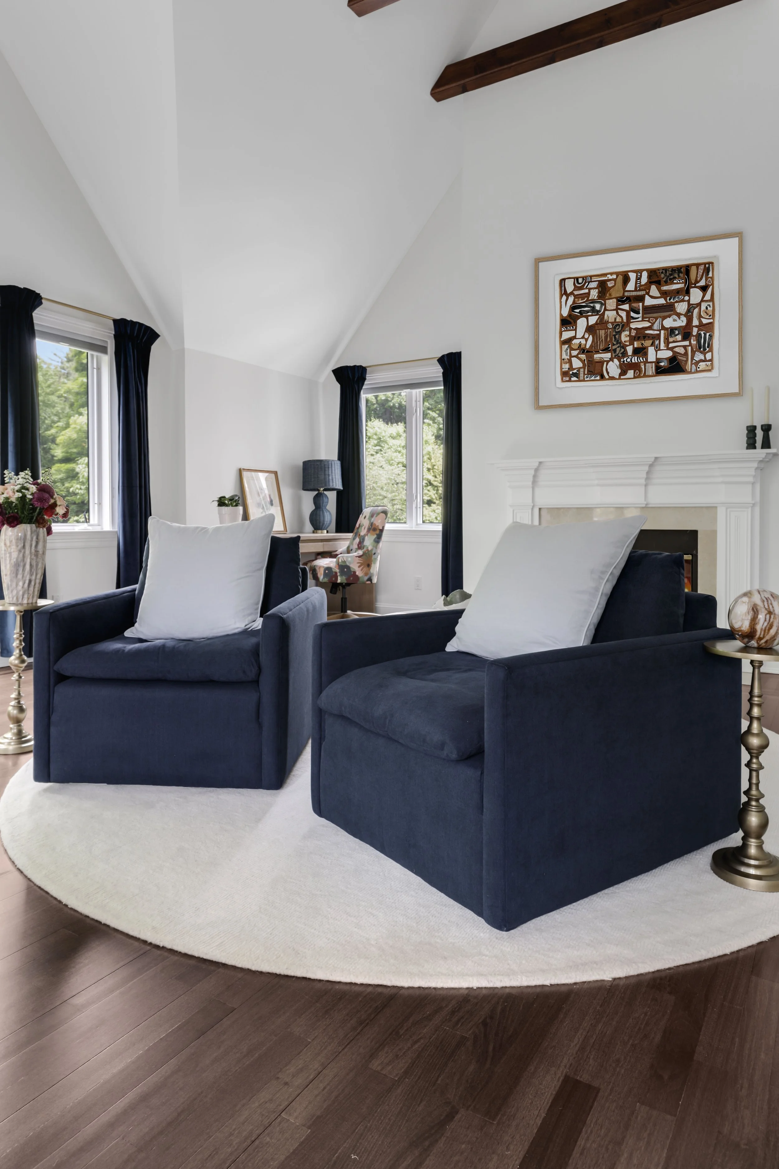 This serene Westchester primary bedroom was designed as a true sanctuary for rest, relaxation, and quiet productivity. Vaulted ceilings, a fireplace, and abundant natural light gave us the perfect canvas to design a multi-functional retreat. We defined three zones—sleeping, lounging, and working—within one cohesive, airy layout. The muted color palette layered over crisp white walls keeps the space feeling fresh, calm, and inviting. A modern bedroom retreat that’s both practical and beautiful.